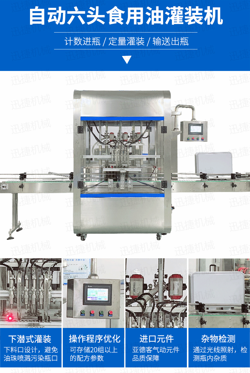 該系列灌裝機(jī)采用伺服柱塞式計(jì)量灌裝原理,適用于各種規(guī)格(0.1-1升可兼顧到2升灌裝)的南瓜籽油、榛子油、牡丹籽油、芝麻油、核桃油、山茶油、亞麻籽油、棉籽油、橄欖油、大豆油、玉米油、菜籽油等食用油灌裝。設(shè)備采用伺服系統(tǒng)定量推料,在人機(jī)界面數(shù)字化調(diào)節(jié)計(jì)量,并且可設(shè)定100ml或200ml等所需計(jì)量,觸摸屏一觸即達(dá),而且可以單頭微調(diào)計(jì)量。操作簡(jiǎn)單,維護(hù)方便,節(jié)省人工成本,生產(chǎn)效率更高。